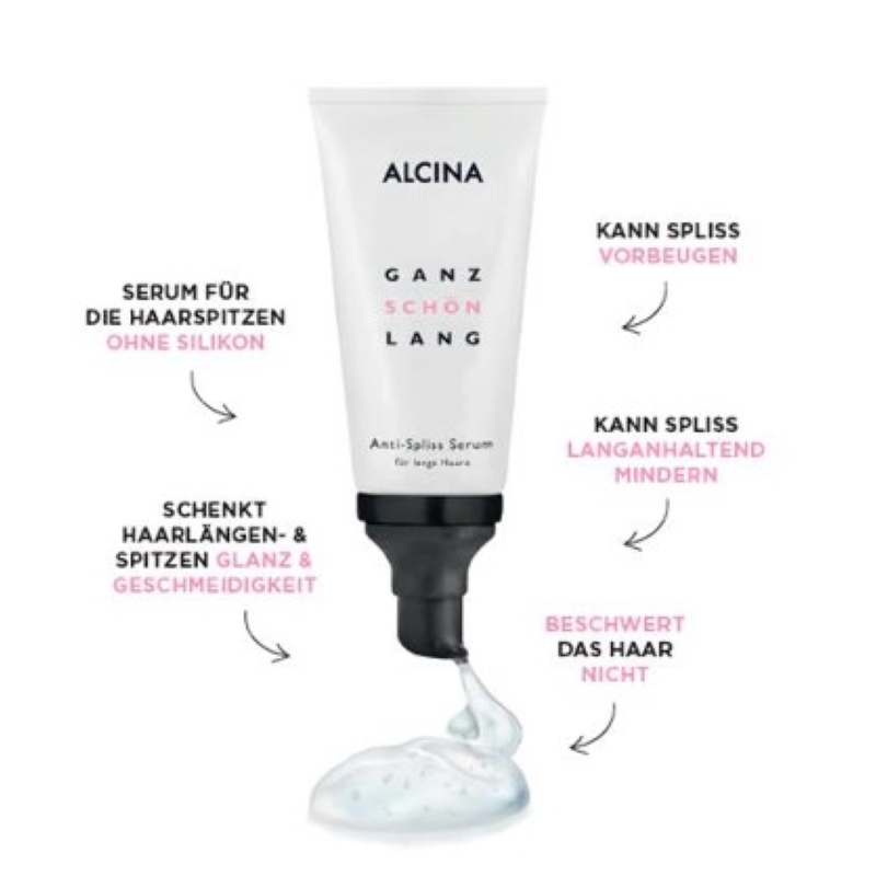 Das neue ALCINA GANZ SCHŌN LANG Anti-Spliss Serum verspricht: Nie wieder Spliss-Stress! Es wurde speziell entwickelt, um die Haarspitzen zu pflegen und zu schützen – ohne Silikon. Denn sie sind der strapazierteste Teil des langen Haares. Da das Serum sowohl nach der Haarwäsche in handtuchtrockenem Haar als auch in trockenem Haar anwendbar ist, kann man seine Haarspitzen täglich verwöhnen. So kann Spliss langanhaltend gemindert und neuem Spliss vorgebeugt werden, damit langes Haar auf Dauer GANZ SCHŌN LANG bleibt. Produkttester*, die das Serum vier Wochen lang anwendeten, bewerteten, dass das Serum weder klebt noch die Haare schwer und fettig macht. Über 90% von ihnen würden das Produkt weiterverwenden, da es die Haarspitzen glättet und glänzen lässt. Die Bewerter waren nach einer Anwendungszeit von vier Wochen überzeugt: Die Spitzen jedes einzelnen Haares sind glatt und ohne Spliss.