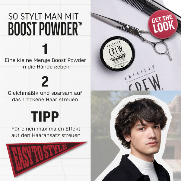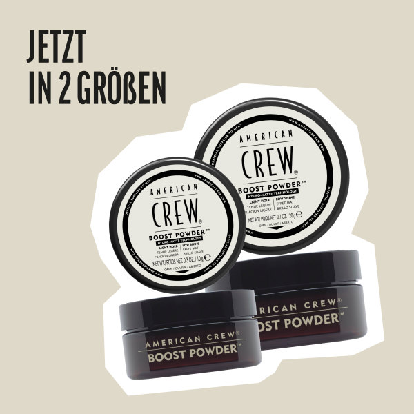 BOOST POWDER Poudre de volume avec effet anti-gravité apportant un fini mat. Donner du volume, de l’épaisseur et un fini mat à vos cheveux avec la Poudre énergisante American Crew. Cette poudre ultralégère ajoute des petites particules donnant une texture défiant les lois de la gravité. Et, elle peut être combinée avec quasiment tous les autres produits coiffants d’American crew. Application: Tapoter le palet plusieurs fois pour effriter la Poudre énergisante, puis verser une petite quantité dans votre main. Saupoudrer légèrement et uniformément sur cheveux secs, en vous assurant que le produit atteigne bien les racines pour un effet de décollement et de séparation maximum. À associer à la crème énergisante ou à d’autres produits coiffants American Crew pour plus de volume et de possibilités de coiffage. Bénéfices: Conserve l’humidité naturelle et rend les cheveux plus doux. Apporte une fixation souple et rend les cheveux plus épais. A un effet revitalisant et restructurant sur les cheveux. American Crew Boost Powder 10g EAN: 738678250013