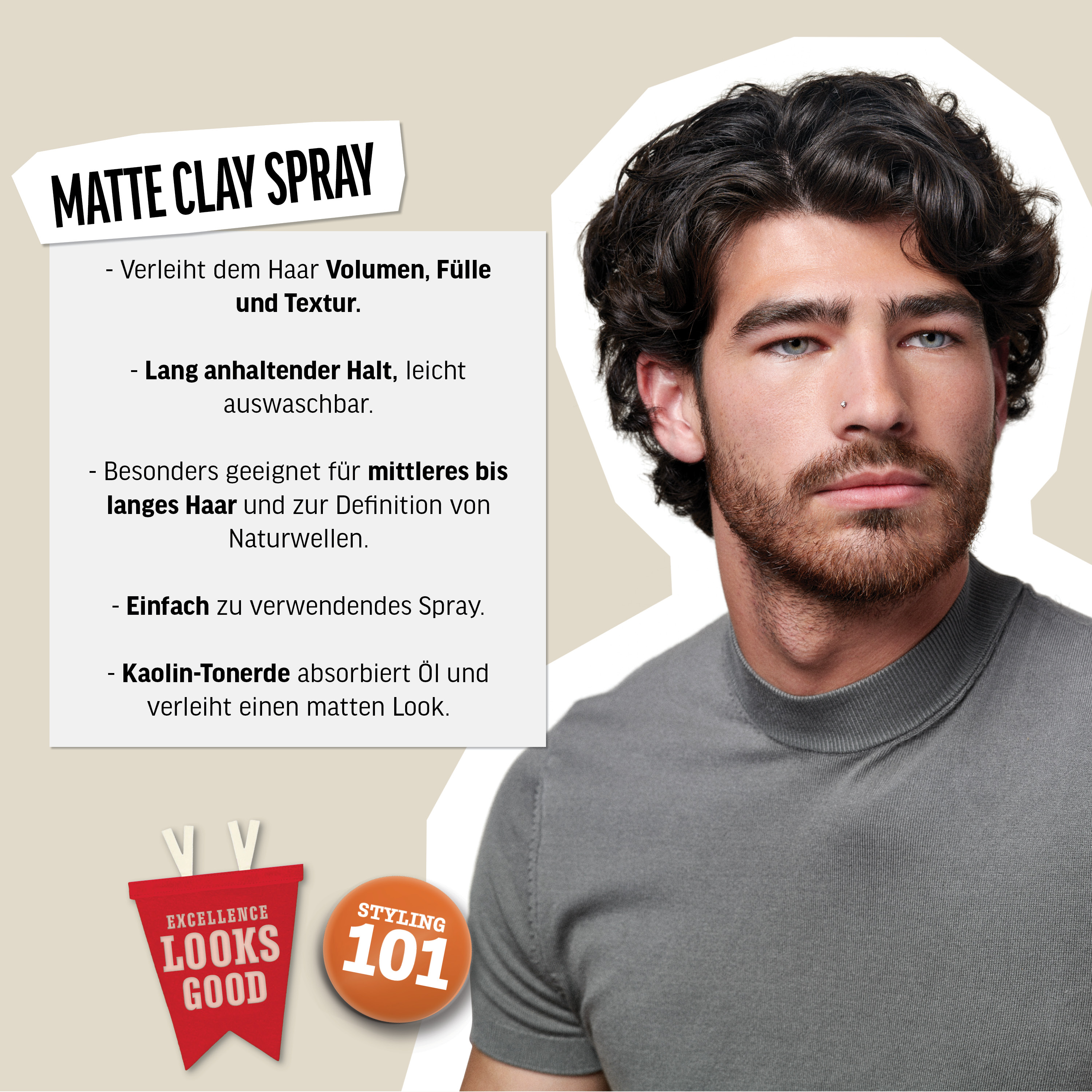 C'est un spray texturisant absorbant l'huile qui offre une tenue moyenne forte et un aspect mat toute la journée. Comme la cire coiffante Matte Clay originale, la formule est également à base d'argile kaolin. Le nouveau spray contrôle les frisottis, ajoute du volume et renforce les ondulations naturelles. Le spray à l'argile mate offre tous les avantages de l'argile et constitue également une aide précieuse pour un coiffage rapide et facile. Il offre une tenue longue durée ainsi que du volume et de la texture.