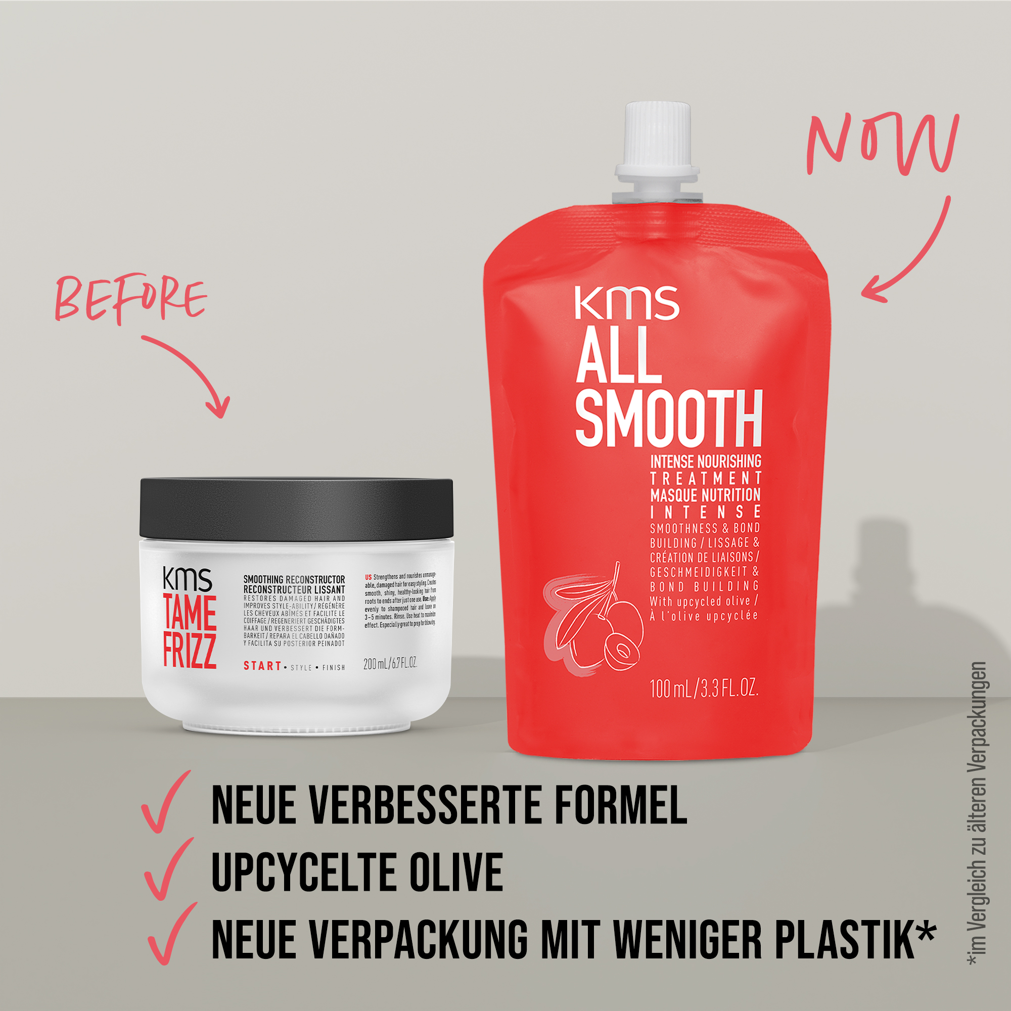 Tamefrizz devient Allsmooth. Le traitement anti-frisottis populaire de KMS entre dans la nouvelle génération et le successeur de Smoothing Reconstructor est l'arme secrète pour les cheveux crépus et abîmés. Il lisse visiblement, renforce la structure capillaire de l'intérieur et rend vos cheveux visiblement plus lisses, plus brillants et plus faciles à coiffer, dès la première utilisation. La technologie innovante de renforcement des liaisons capillaires renforce la structure capillaire de l'intérieur, protège contre la casse et améliore visiblement l'élasticité.