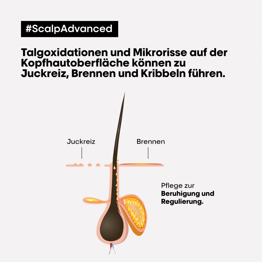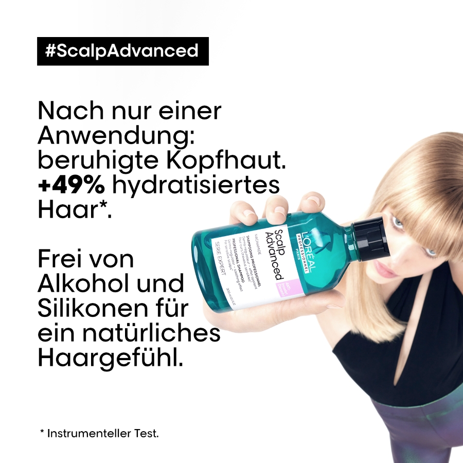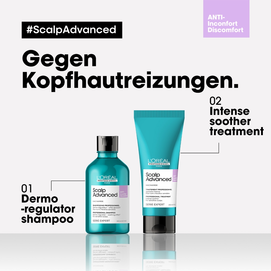 Das L'Oréal Professionnel Paris Série Expert Scalp Advanced Anti-Discomfort Dermo-Regulator Shampoo wurde speziell zur Beruhigung empfindlicher Kopfhaut entwickelt. Bereits nach der ersten Anwendung wird das Haar beruhigter & +49% hydratisierter.