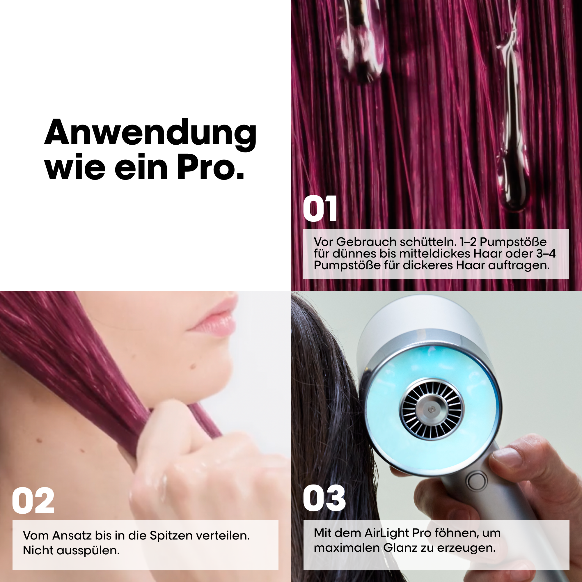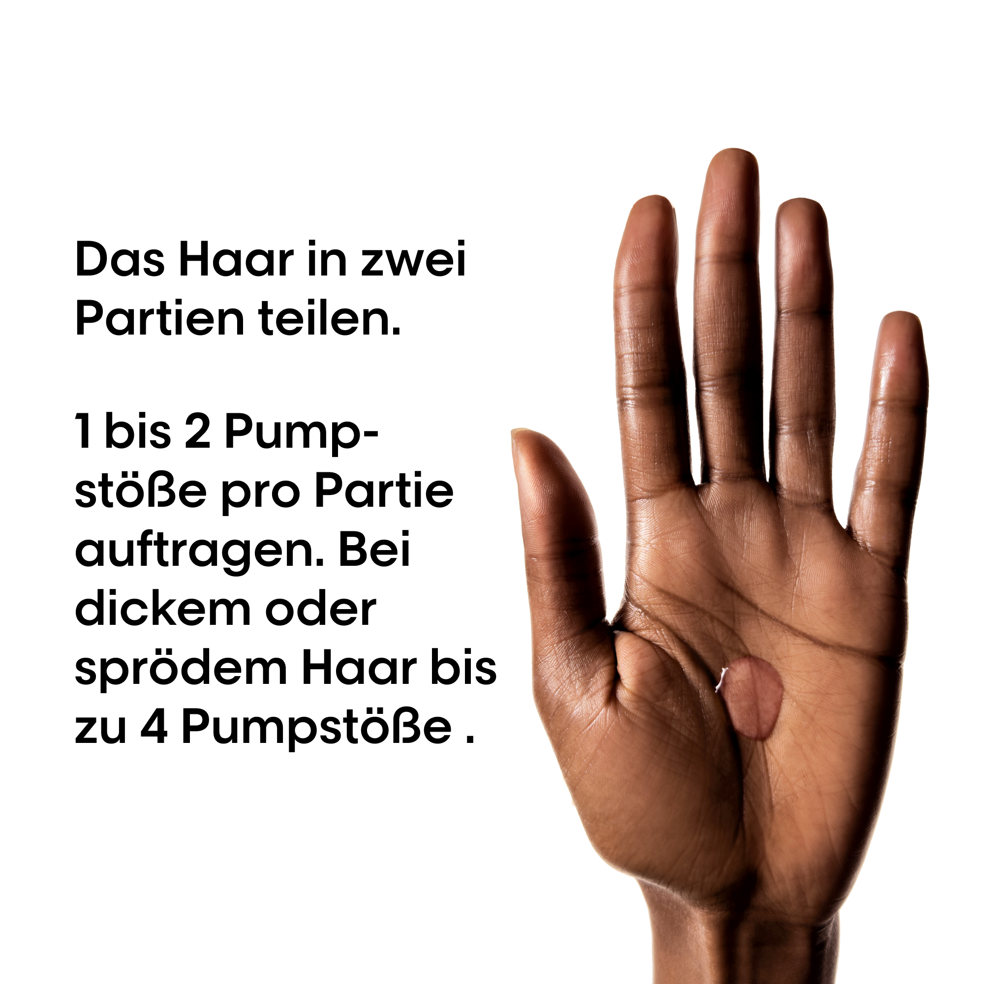 Agiter avant emploi. Appliquer sur cheveux essorés, en les séparant si nécessaire. 1 à 2 pompes pour les cheveux fins à moyens, 3 à 4 pompes pour les cheveux plus épais. Répartir uniformément des longueurs jusqu'aux pointes. Ne pas rincer. Séchez complètement les cheveux avec l’outil chauffant souhaité. Puis lissez avec un fer à lisser. Pour de meilleurs résultats, réglez la température à au moins 180 °C. Conserver dans un endroit frais et sec. Nettoyer et fermer la pompe après chaque utilisation. En cas de contact avec les yeux, rincer avec précaution à l'eau. Un changement d’odeur au fil du temps est normal en raison des ingrédients puissants et n’affecte pas l’efficacité.