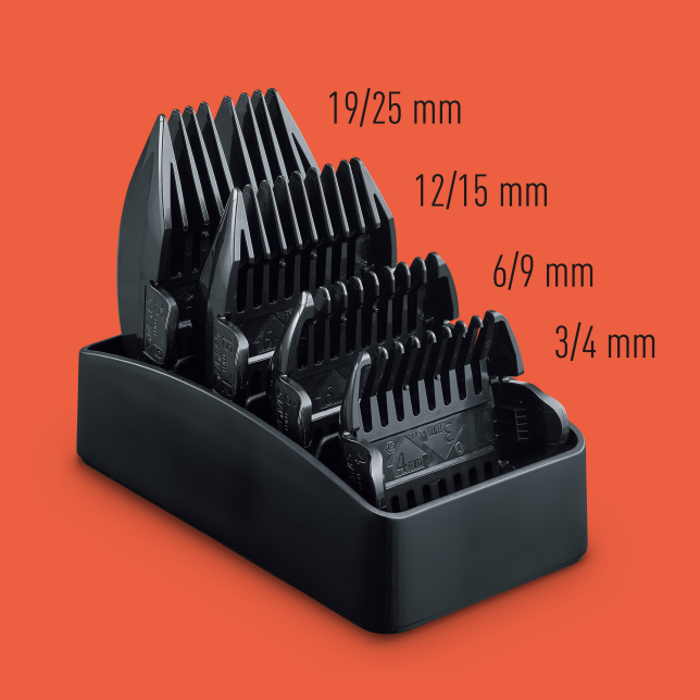 Accessoires: 3 accessoires de peigne (3 / 4mm, 6 / 9mm, 12 / 15mm), station de charge, repose-peigne, huile et brosse de nettoyage