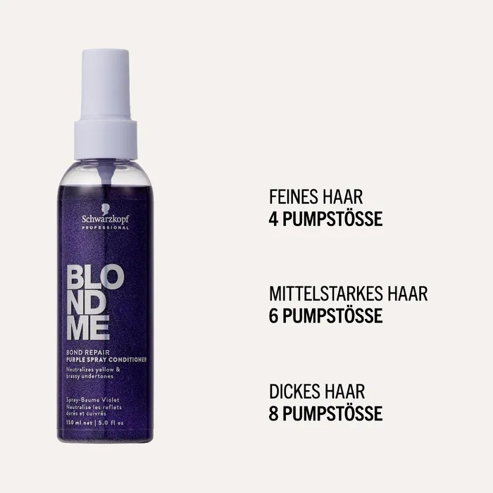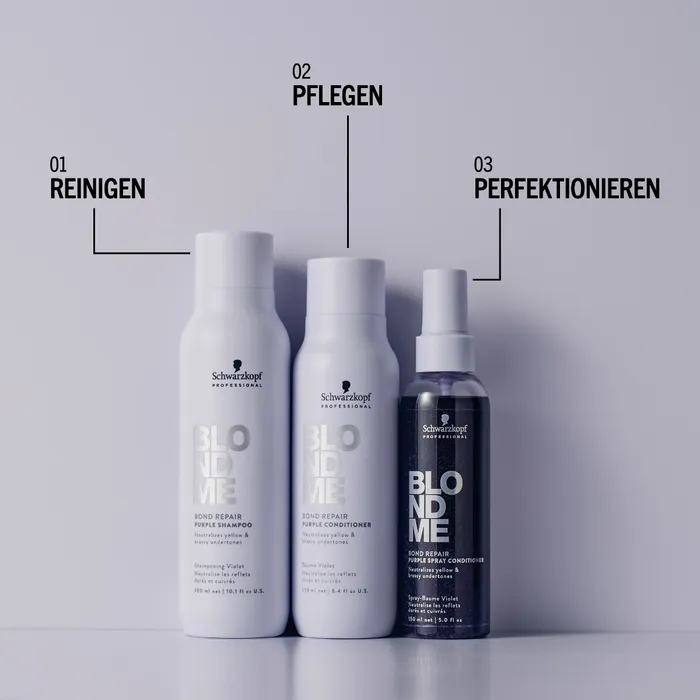BLONDME Care est destiné aux clientes aux cheveux blonds ou éclaircis qui recherchent un soin capillaire professionnel pour protéger et renforcer leurs cheveux. L'après-shampoing en spray violet BLONDME Bond Repair est destiné aux clientes qui souhaitent rafraîchir leur blond et éliminer les reflets jaunes tout en prenant soin de leurs cheveux.