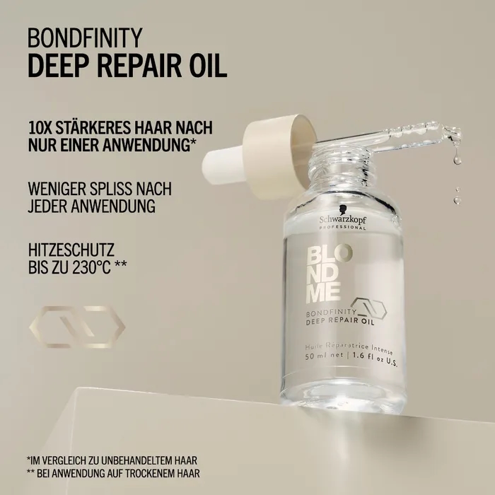 L'huile réparatrice profonde BLONDME avec la technologie BONDFINITY répare et renforce en profondeur les cheveux blonds et éclaircis sans les alourdir. Elle restaure la santé capillaire en créant des liaisons permanentes et en scellant la kératine naturelle du cheveu : une réparation proactive et durable pour des cheveux 7 fois plus forts dès la première utilisation*. Il lisse également les cheveux poreux pour une brillance éclatante, offre un contrôle des frisottis 24 heures sur 24 et les protège des dommages causés par le coiffage grâce à une protection thermique à 230 °C.
